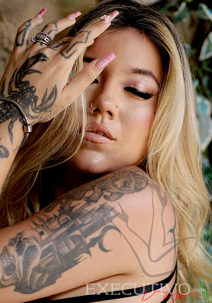 "Loira, tatuada e dona de uma beleza marcante. Rosto encantador, atitude sedutora e presença que hipnotiza. Sofisticação, charme e um toque de ousadia para quem busca momentos inesquecíveis."